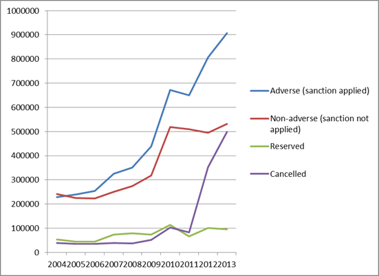 ‘Reserved’ referrals, where the decision maker says a sanction should be applied, but where there is no current claim, have almost doubled from 53,026 in 2004 to 99,964 in 2012. There was a small drop in the number of these cases in 2013 to 95,087.